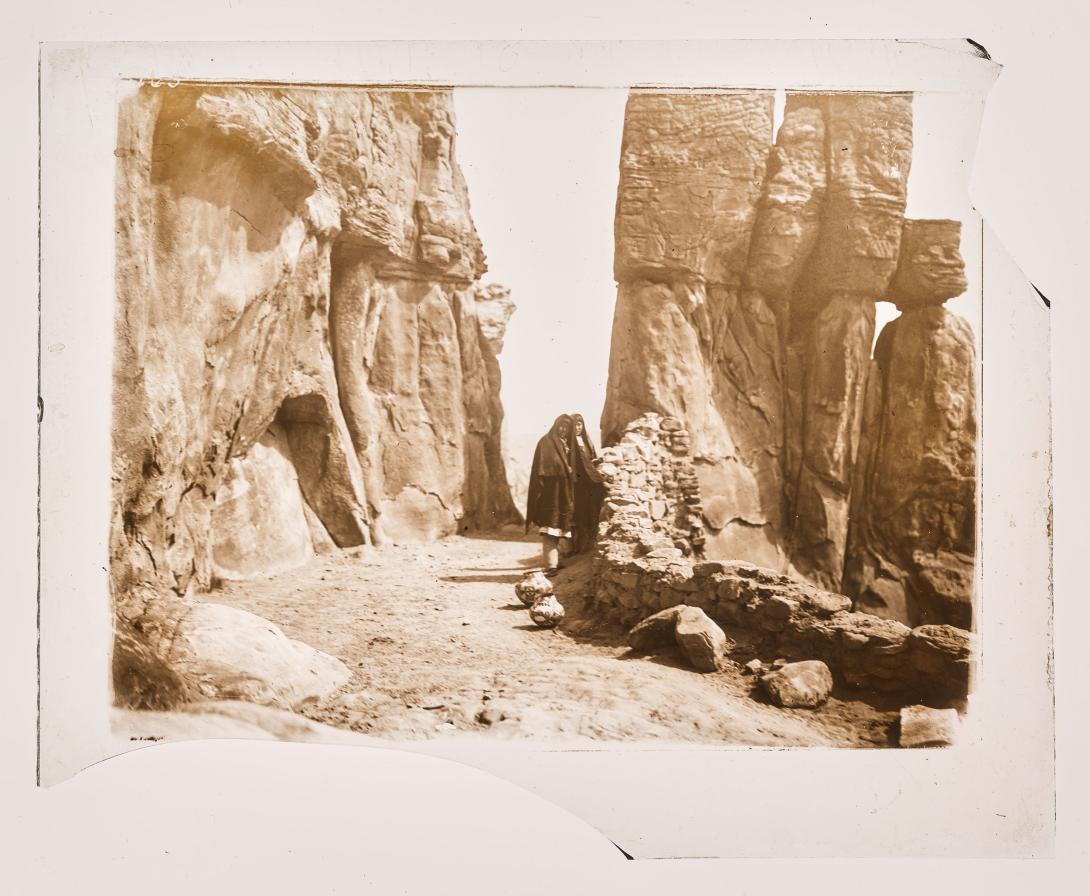 Two unidentified women on a path between high rocks (Acoma Pueblo).