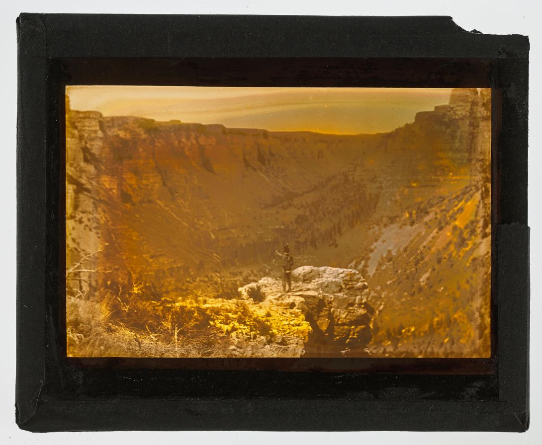 An unidentified man stands on an elevation of rock in the middle of a vast canyon (Apsáalooke/Crow).