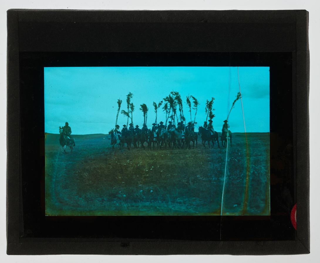 A group follow a leader on horseback, returning from the sweat lodge, carrying tall willow branches (Pikuni Blackfeet/Piegan).