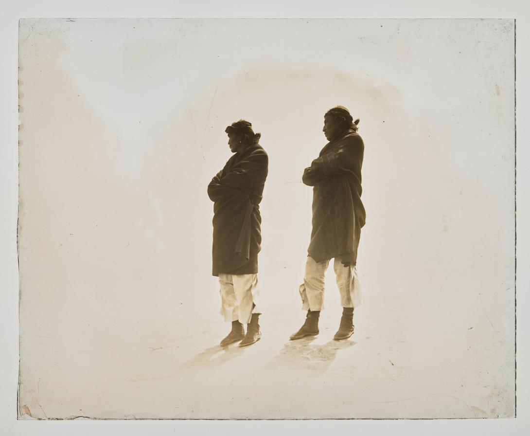 Two unidentified Native American men standing, looking off into the distance.