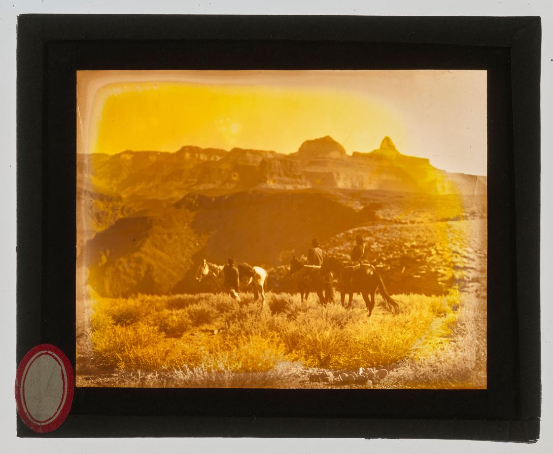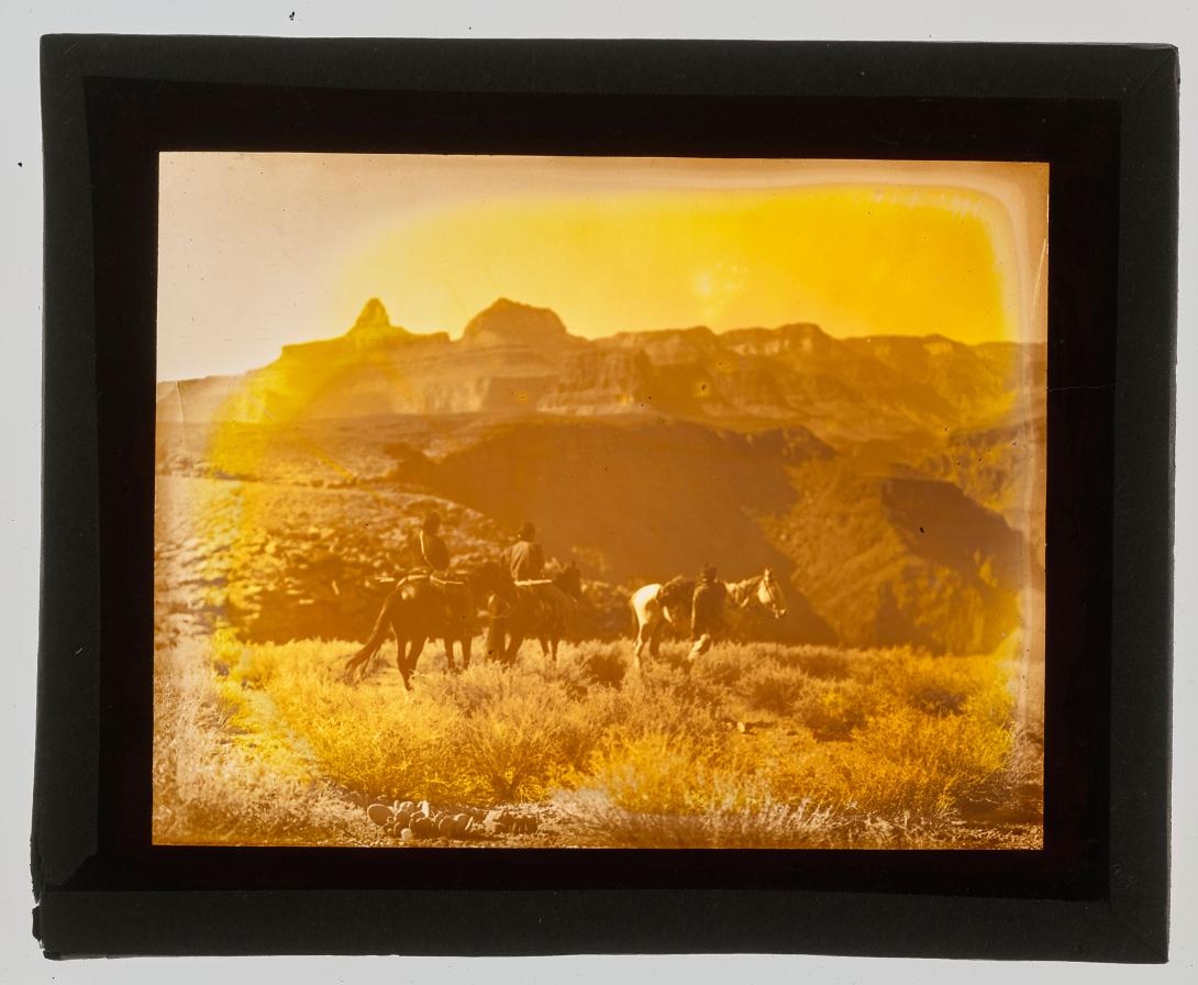 Title from the Smithsonian Virtual Online Archives (SOVA), National Museum of Natural History, National Anthropological Archives (viewed May 2021): Guide to the Edward S. Curtis papers and photographs, circa 1895-2001; series 9.4: Other Photographs, Grand Canyon series, ca. 1915, box G34; ESCgc11: Men and horses at the Grand Canyon.