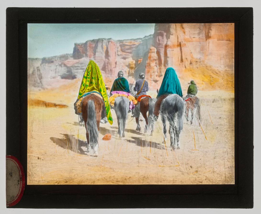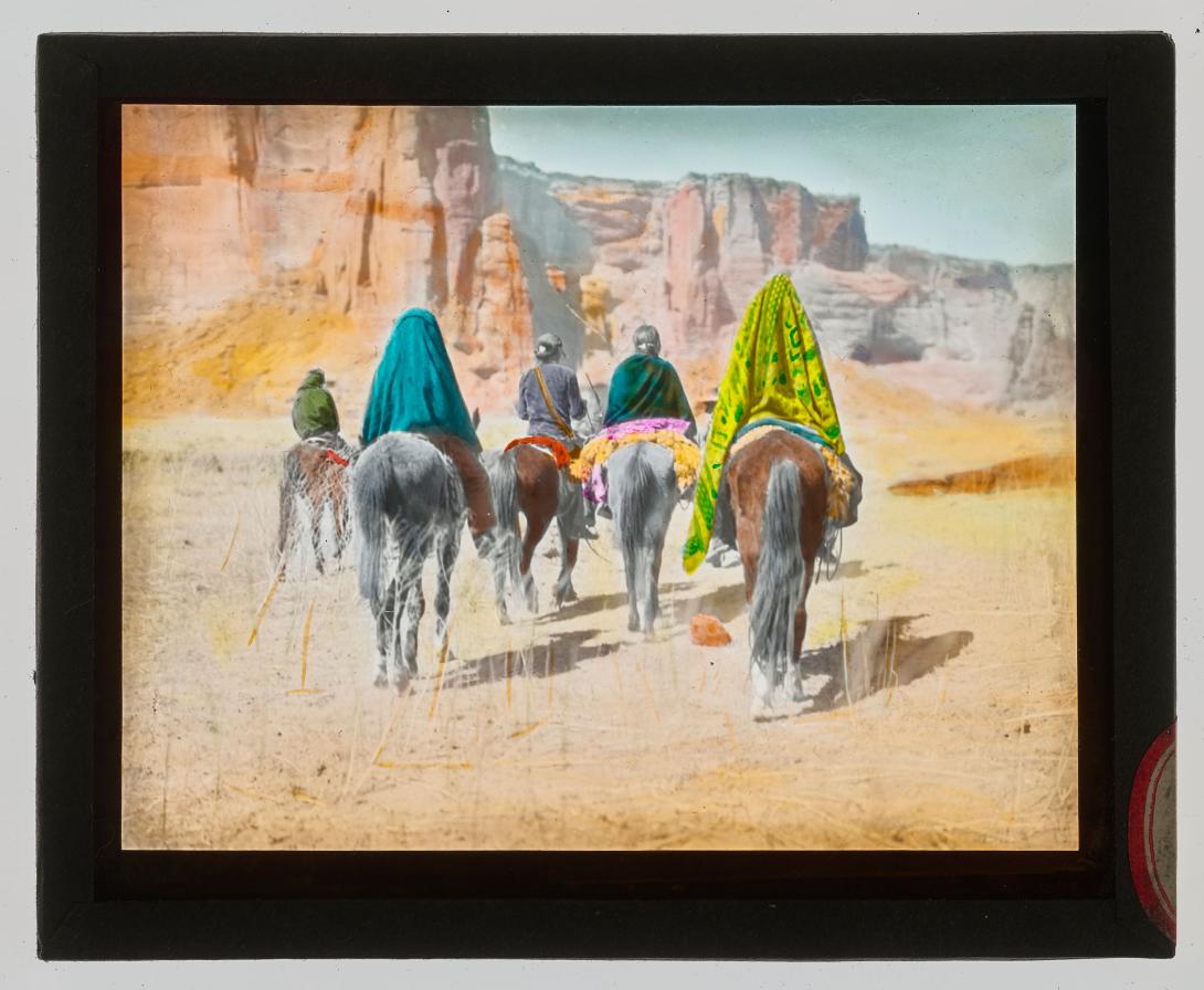 Image also available in the Library of Congress online catalog (viewed May 2021): Edward S. Curtis Collection (Library of Congress), LOT 12311, Library of Congress number 2003652731; dated ©1905, Curtis no. 1025-06, title: March through Tesacod Canyon, summary: Rear view of Navajo Indians on horseback making their way over the sparse, dry, grassy floor of Tesacod Canyon.