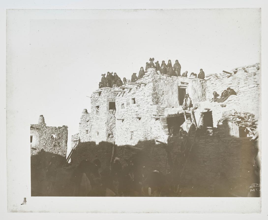 A crowd gathered on a pueblo rooftop to observe a dance (Hopi).