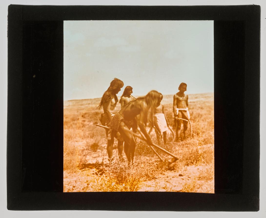 Image also available in the Library of Congress online catalog (viewed May 2021): Edward S. Curtis Collection (Library of Congress), LOT 12315, Library of Congress number 99471721; dated ©1907, Curtis no. 2110-06, title: Digging out the snakes--Hopi, summary: Group of Hopi Indians [identified in related images as snake priests in] using hoes to dig out snakes.