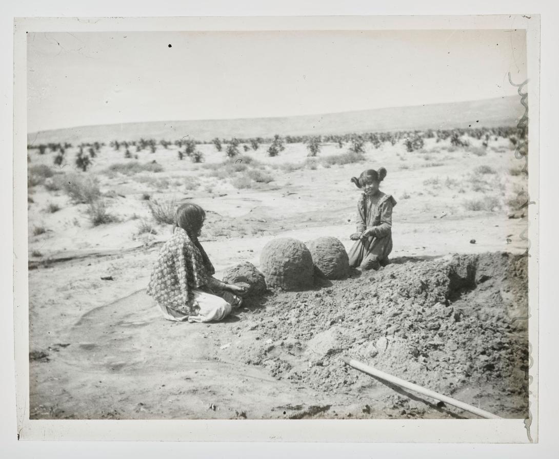 Two unidentified Native Americans sit on the ground near a mound of clay, the handle of a tool is seen in the foreground (possibly Hopi).