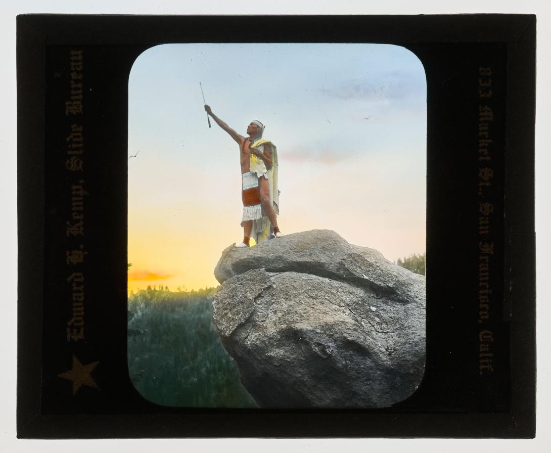 A Native American man stands atop a rock, with one arm raised holding an arrow and a cloth draped over the opposite shoulder.