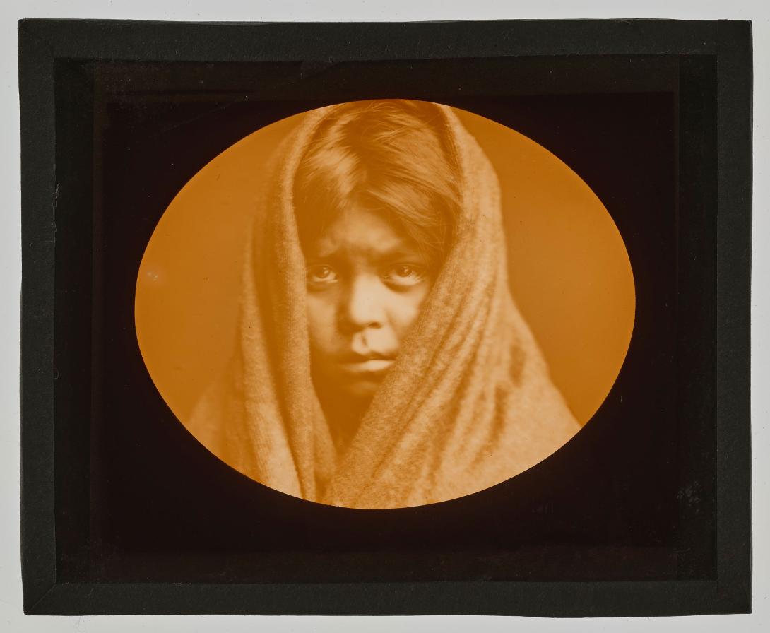 Head-and-shoulders studio portrait of an unidentified child, with a shawl wrapped around its head and shoulders, facing front (possibly Diné/Navajo).