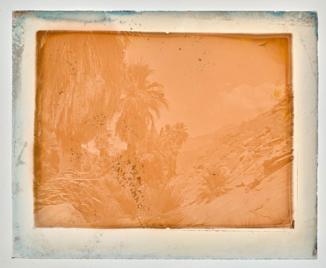 Palm trees and agave in a rocky landscape, possibly Palm Canyon, California.