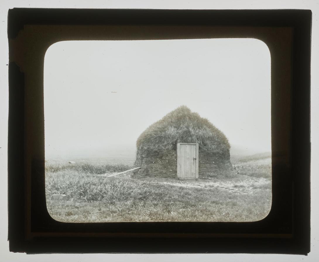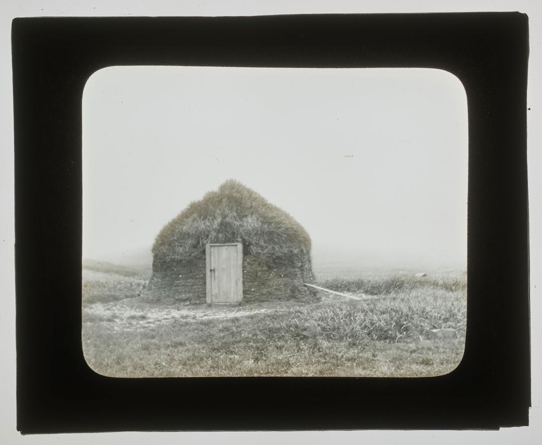 Frontal view of earthen hut, Pribilof Islands, Alaska