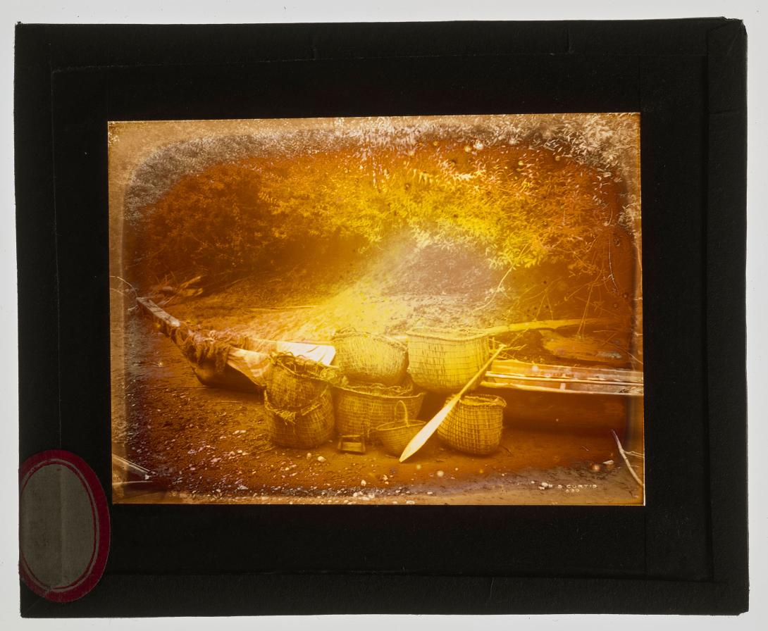 Canoe and baskets, possibly Duwamish (Dwamish), gathered at the shore.