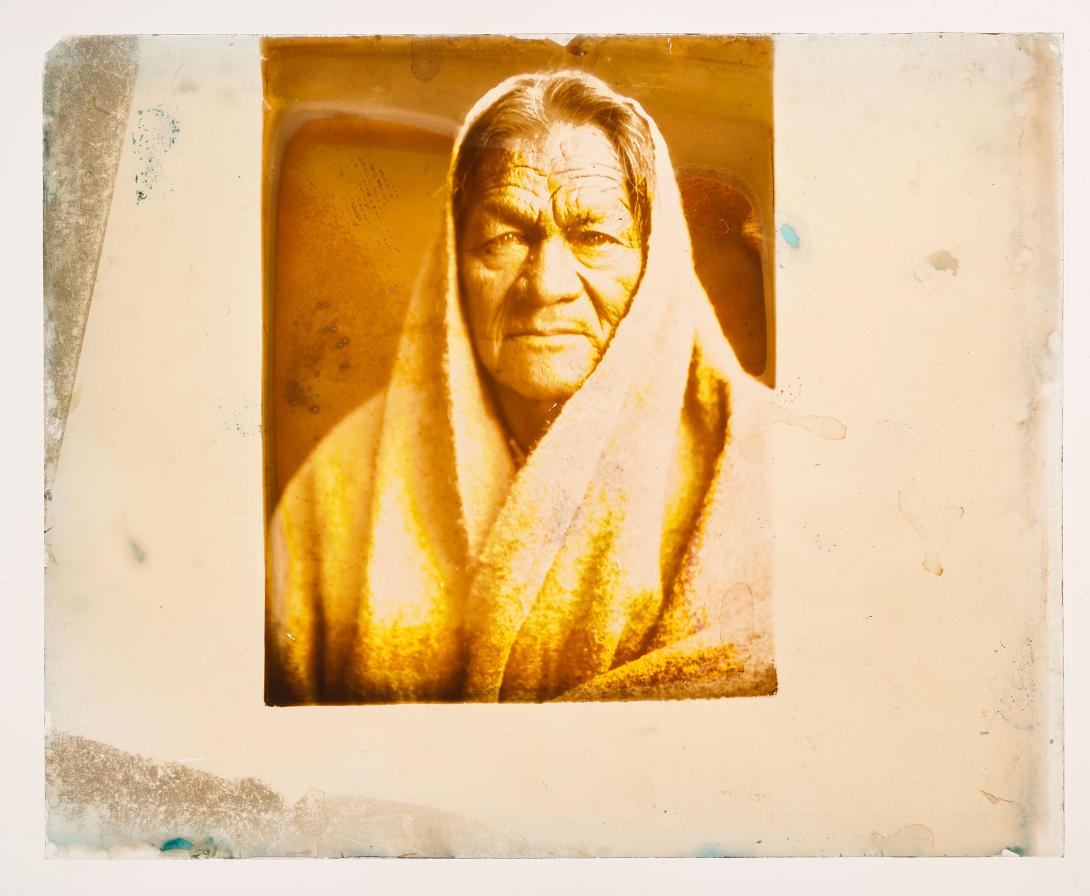 Head-and-shoulders studio portrait of an unidentified Native American man with a blanket wraped around his shoulders and head, facing front.