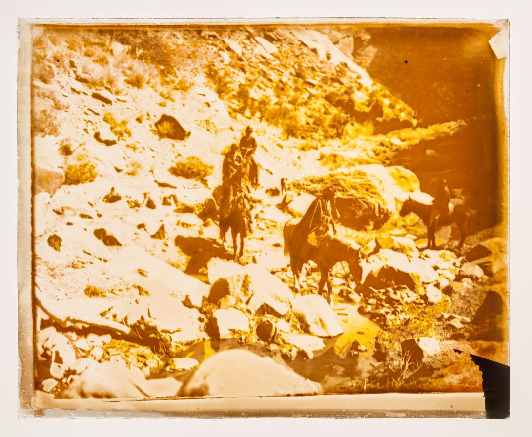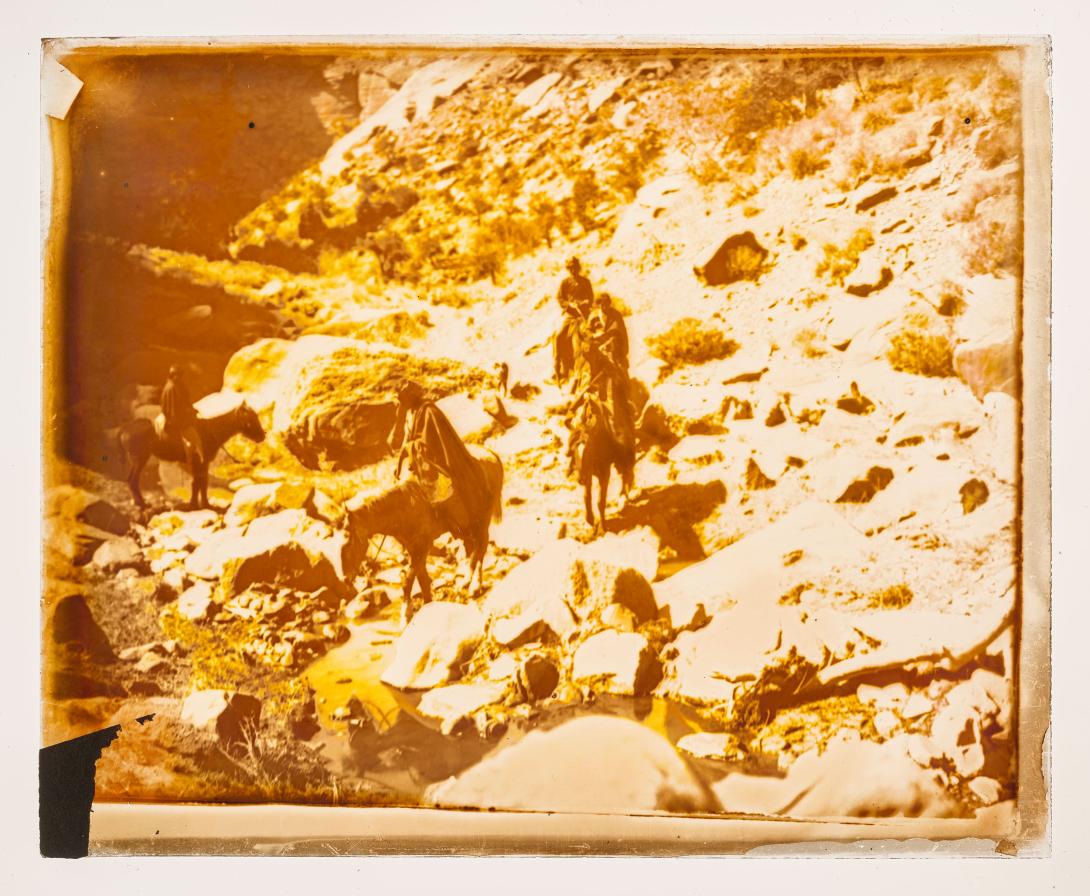 Five unidentified Native Americans on horseback traverse rocky ground.