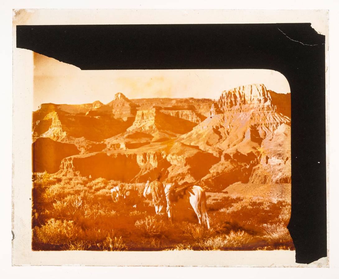 Title from the Smithsonian Virtual Online Archives (SOVA), National Museum of Natural History, National Anthropological Archives, Guide to the Edward S. Curtis papers and photographs, circa 1895-2001; series 9.4: Other Photographs, Grand Canyon series, ca. 1915, box G34; ESCgc8: Man and horse beside cactus at the Grand Canyon. (viewed May 2021)