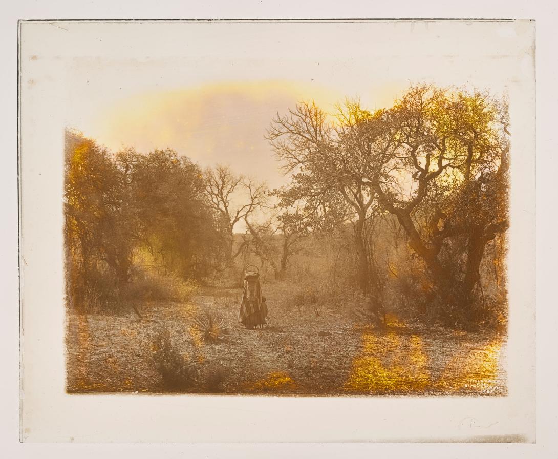 A woman and children standing among oak trees, beneath a blank sky (Apache).