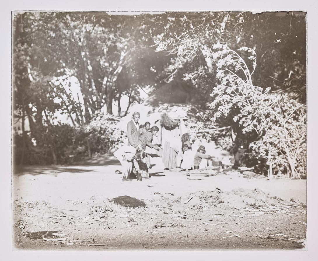 A group of unidentified Native Americans gathered near shady trees (possible Diné/Navajo).