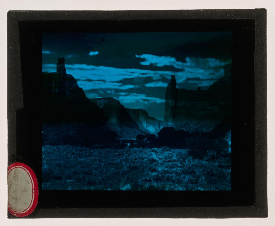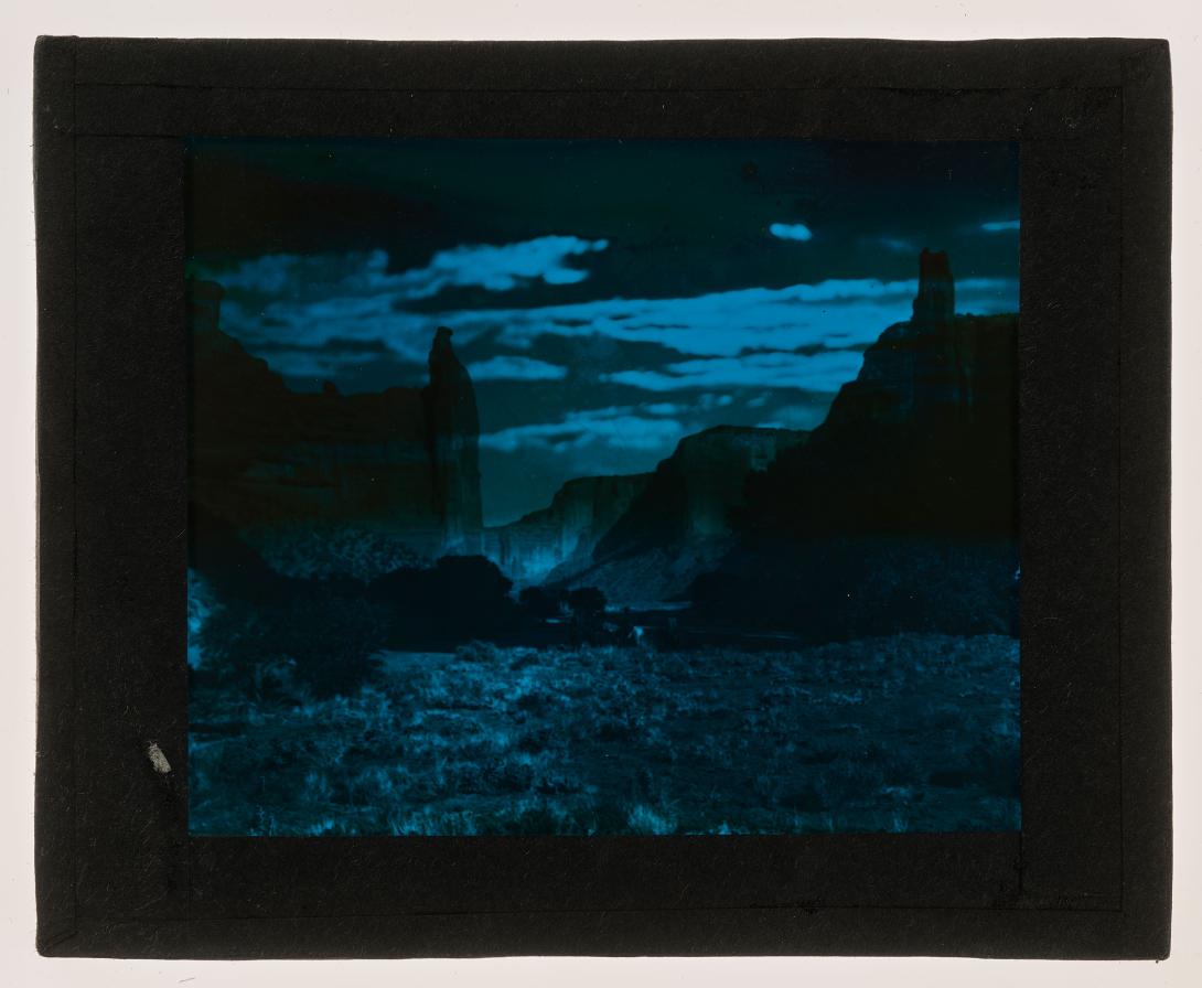 1 lantern slide : photograph on glass, blue tinted ; 3 1/4 x 4 inches (lantern slide format)