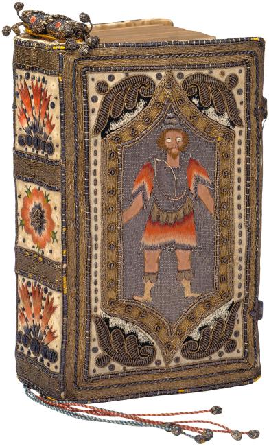 Embroidered in gold and silver thread with a full-length figure in a panel on each side, with the original book-marker, enclosed in a silk bag in a niger case.