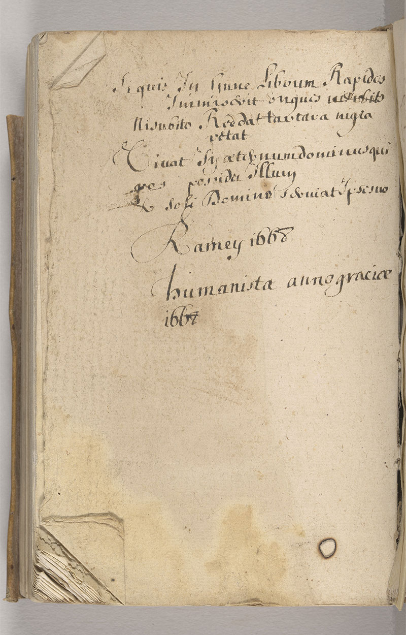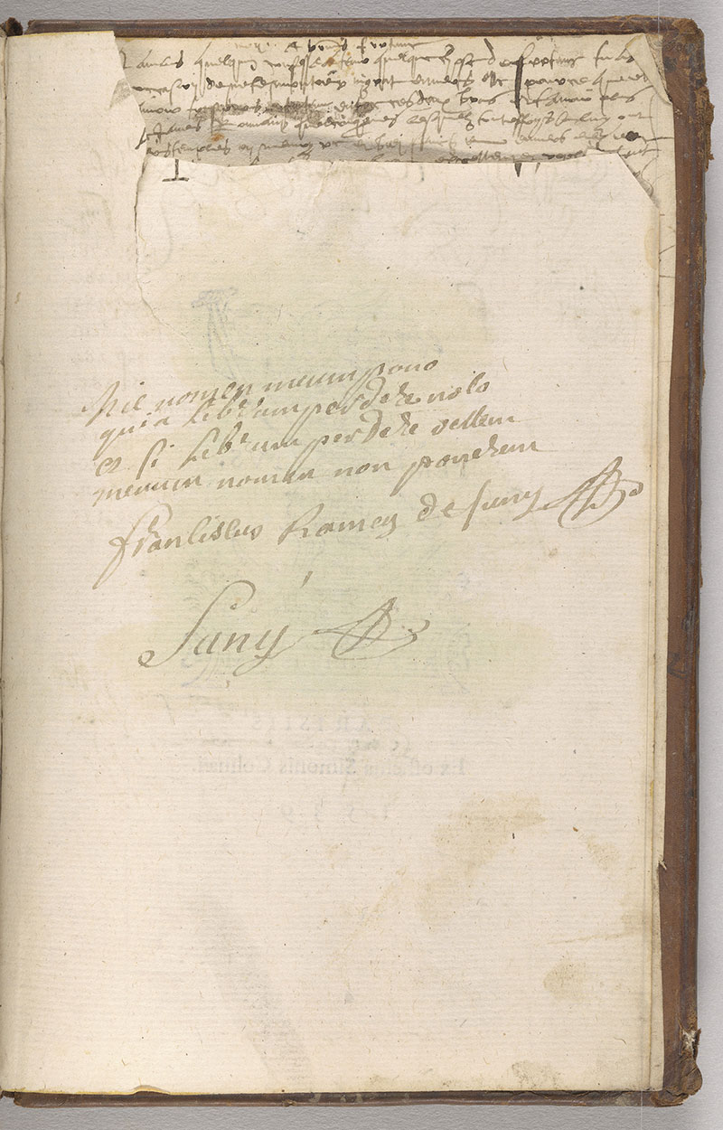 Possible book curse reads: "Hic nomen meum pono quia Librum perdere nolo et si Librum perdere vellem meum nomen non posser[?] / Franciscus Ramey de Suny [sic]."