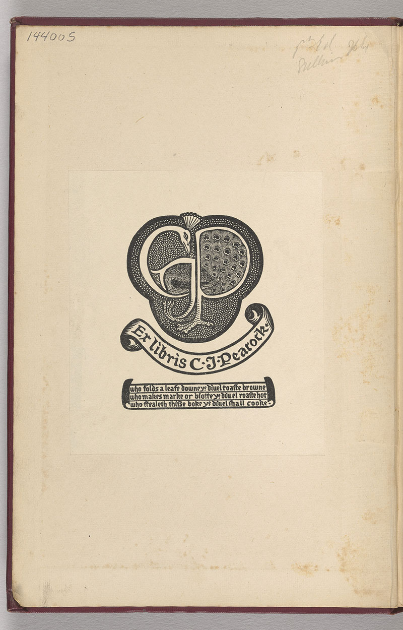 Cursing a book in order to keep it is not a practice lost to time. Both Baker’s book and Drogin’s playfully feature their own little maledictions. Likely readers of this very post might have inscribed threatening messages in a journal, as Aldus Huxley’s fictional character Jenny does in Chrome Yellow12: “Black is the raven, black is the rook / But blacker the thief who steals this book!” The Morgan has at least one example of a modern curse in the form of collector CJ Peacock’s bookplate (in PML 144005), a copy of Lavengro: The Scholar, the Gypsy, the Priest), fashioned in a medieval style13: