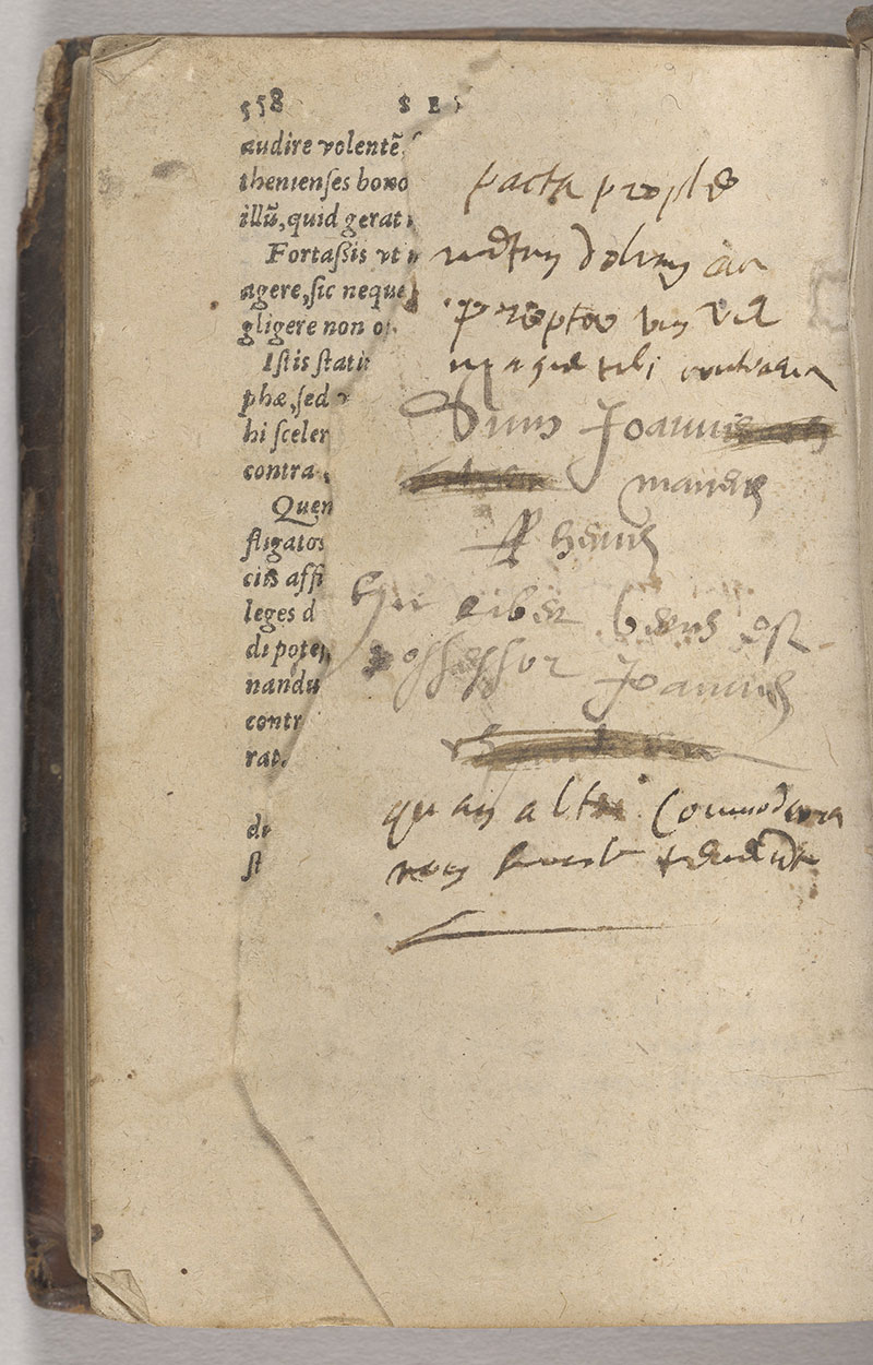 Any threat to the objects themselves, possibly, was a threat to the knowledge stored within—only accessible as long as the book remained in the owner’s possession. The other “possible book curses”10 I came across were all from sixteenth-century France and were present in five volumes11 owned by the same family, Ramey, who may have made a practice of including book curses, although a researcher would have to verify the inscriptions flagged in our catalog. There are three leather bindings, one sheepskin and one vellum binding. The texts are often annotated and include works about ancient geography, rhetoric, and selected writing from Cicero and Isocrates.