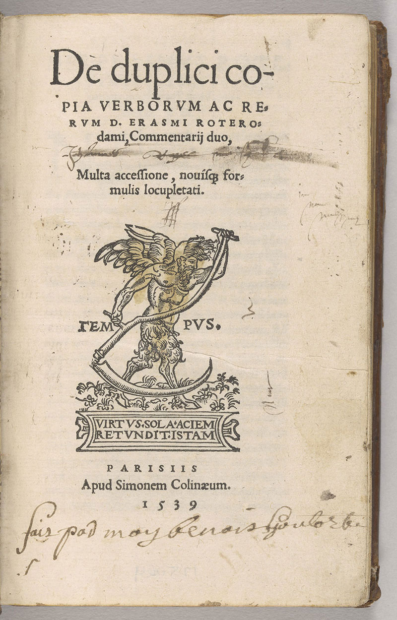 Erasmus, Desiderius, –1536. De duplici copia verborum ac rerum. Paris : Simonem Colinaeum, 1539. The Morgan Library & Museum. PML 125069. Purchased on the Gordon N. Ray Fund, 1988–9.