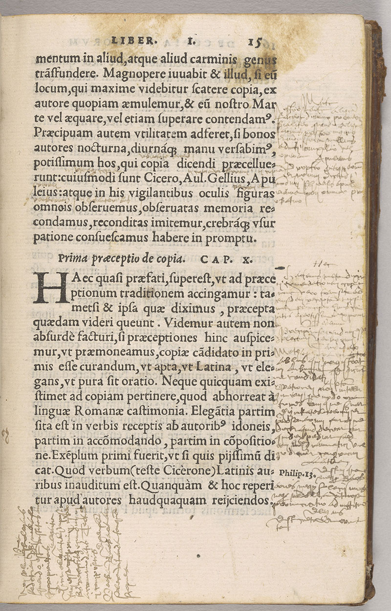 One volume (PML 125069) is a copy of De duplici copia verborum ac rerum, by the humanist scholar Desiderius Erasmus. It is a text instructing readers on how to develop a style and make arguments—a kind of book that serves to beget more writing and knowledge production. The first sentence translates as: “The speech of man is a magnificent thing when it surges along like a golden river, with thoughts and words pouring out in rich abundance.” This copy also has marginalia and annotations throughout the text, suggesting that this was a much-used volume.