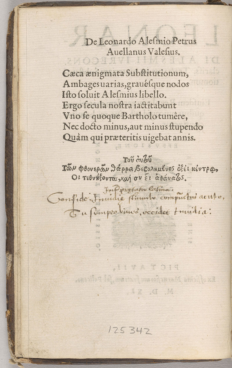 Aleme, Leonard. Leonardi Alesmii iurecons. clariss. Tractatus in materiam substitutionum., verso of title page. Poitiers : Ex officina Marnefiorum fratrum ..., 1540. The Morgan Library & Museum. PML 125342. Purchased on the Gordon N. Ray Fund, 1988–9.