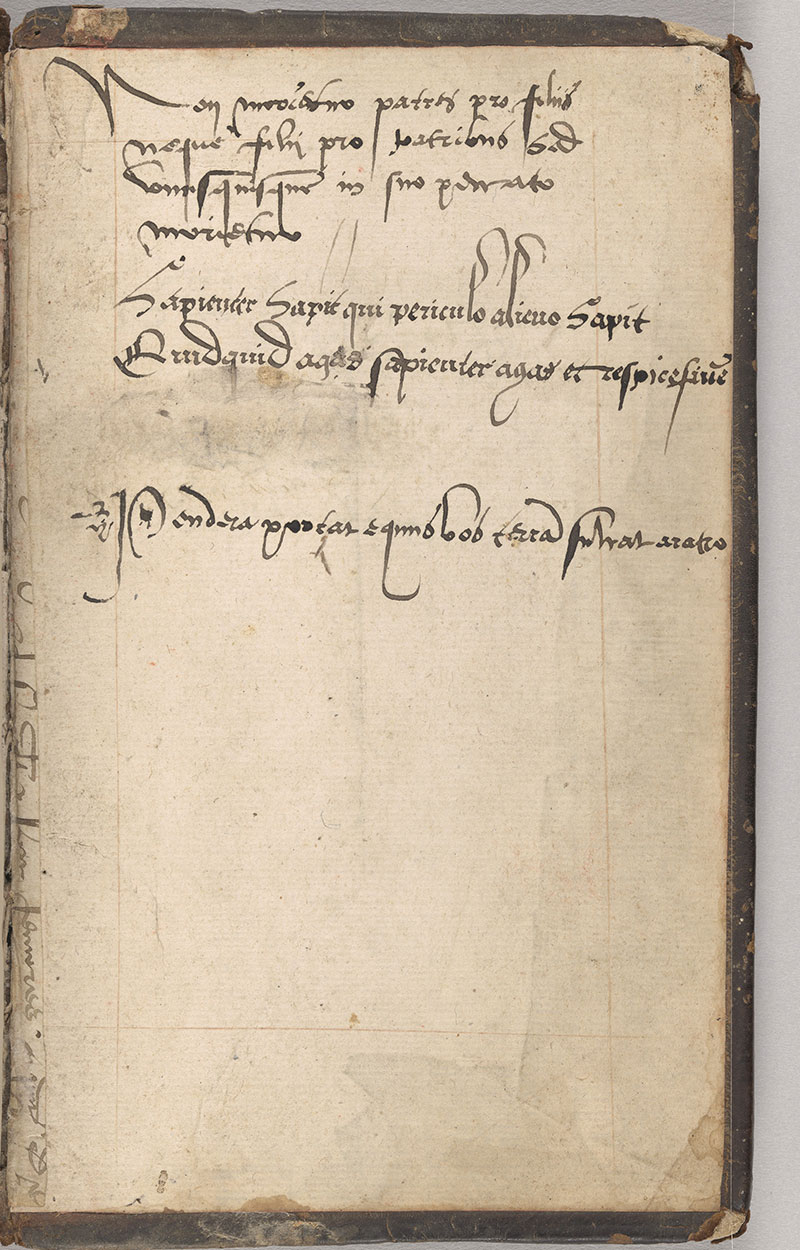 Inscriptions (Latin proverbs) inside lower cover read: "Non p[?] patres pro filiis neque filii pro patribus suis sid"; second inscription unidentified; "Sapienter sapit qui periculo alieno sapit Quidquid agas sapienter agas et respice fine"; final inscription unidentified. More information in our catalog record.