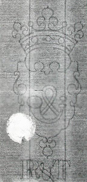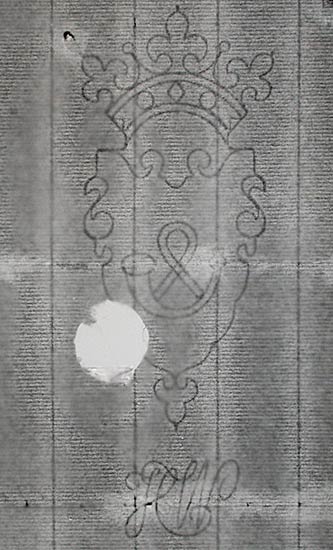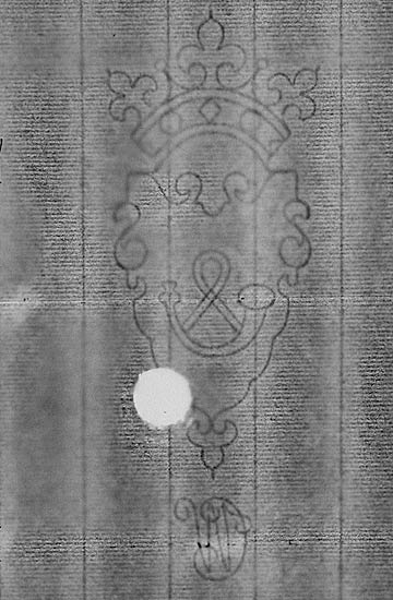 A watermark is an image—often of a name, initials, or decorative motif—that can be detected as a negative image in paper when held up to light. Watermarks can be useful in dating documents, identifying sizes and intended functions of papers, identifying mill trademarks and locations, and determining the quality of a paper. The Morgan's Thaw Conservation Center uses a beta plate to record watermarks. This method uses a low-level radioactive source to penetrate the thin paper and produce a black and white negative—in physical form and appearance it operates very much like a medical x-ray. The beta plate produces an exact copy of the structure of the paper, showing all thick and thin areas as well as the watermark. In some of the beta radiographs seen here, the white spots are the wax seals used to close up the folded letters. The sealing wax, actually colophony resin, is too dense for the beta rays to penetrate.