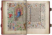 This playful image from a French 15th-century manuscript depicts a topsy-turvy world in which canine patients seek treatment from a rabbit physician wearing eyeglasses. Some years ago, The Morgan was approached by a firm that wished to use the image in an advertisement for imported burgundy. The red liquid in the beaker the rabbit physician is scrutinizing would, it was hoped, illustrate the wine’s superlative body and flavor.