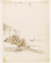 Le pilote (?) allongé, au pied d'une falaise, avec son avion au loin [drawing].