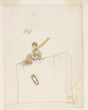 Le petit prince, écharpe au vent, assis sur un mur (dialogue avec le serpent); esquisse de petit prince assis [drawing].