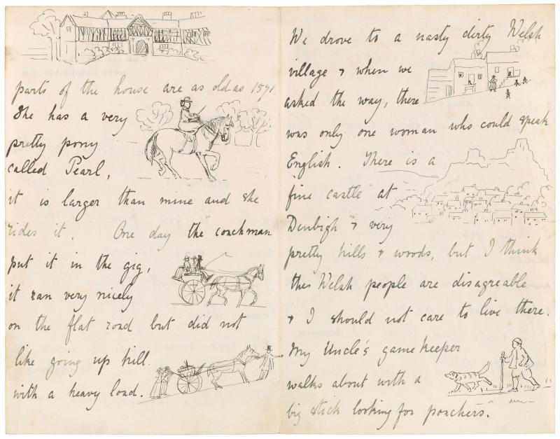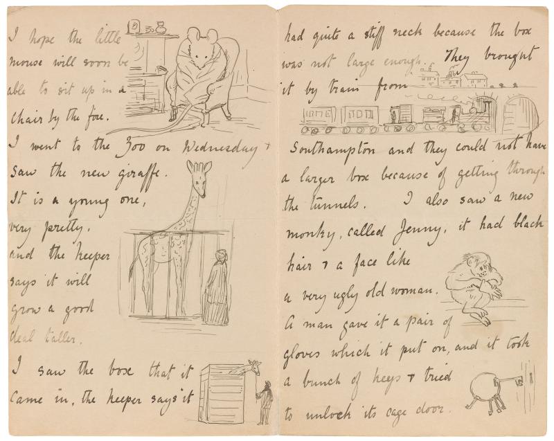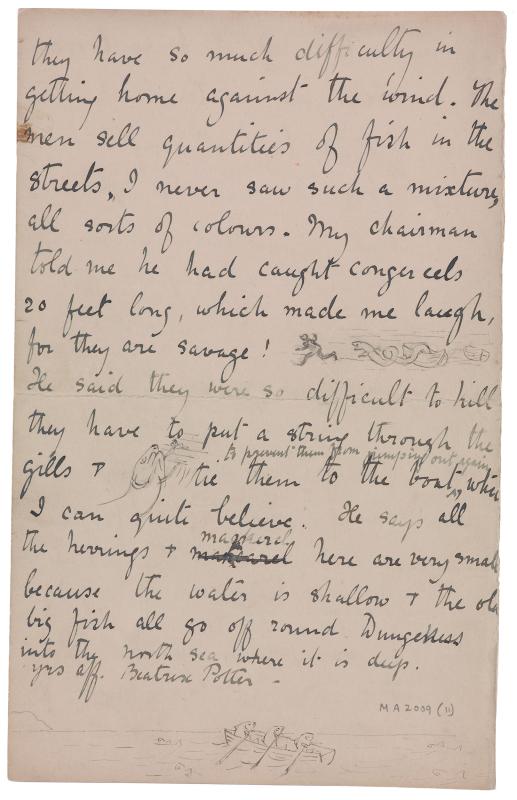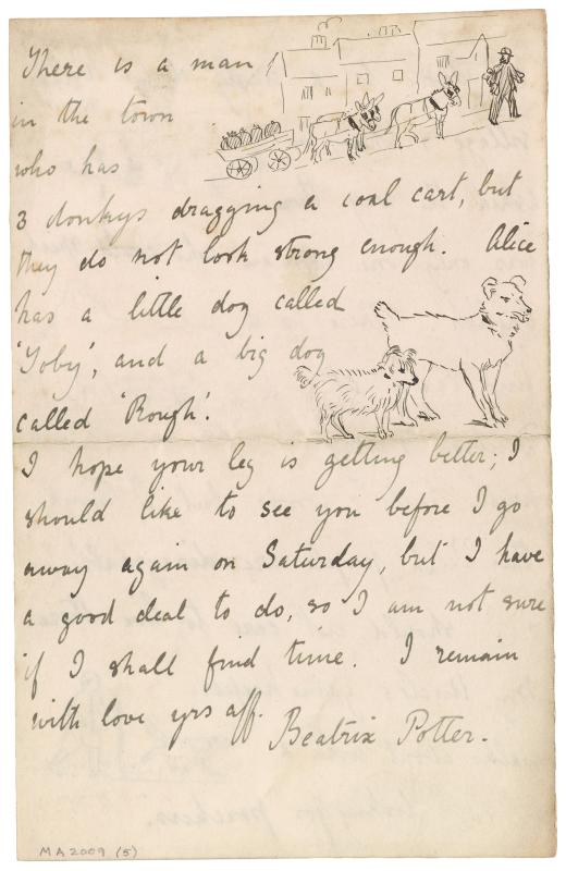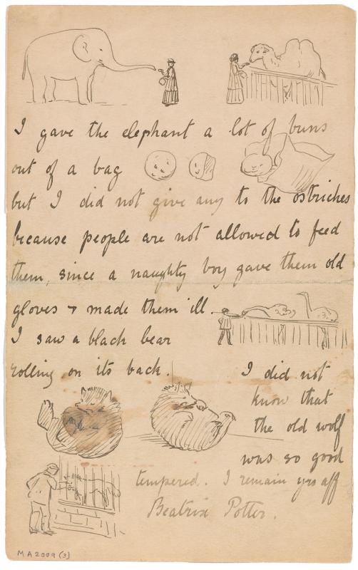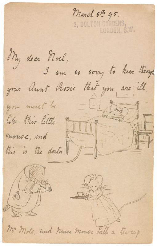 Her books retain the simple joy, subtle wit, and playful immediacy of impromptu private letters written for "real children" on subjects drawn from day-to-day experience with no commercial constraints and no thought of publication. Shown here are the twelve picture letters in the Morgan's collection. Eleven were addressed to Noel Moore, one to his younger sister Marjorie. Here one can see the earliest known picture letter along with later examples containing fanciful illustrations, comical vignettes, and narrative experiments that prefigure Peter Rabbit and other masterpieces of children's literature.