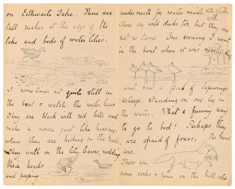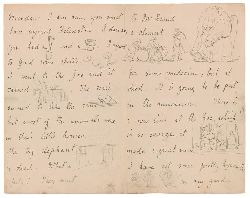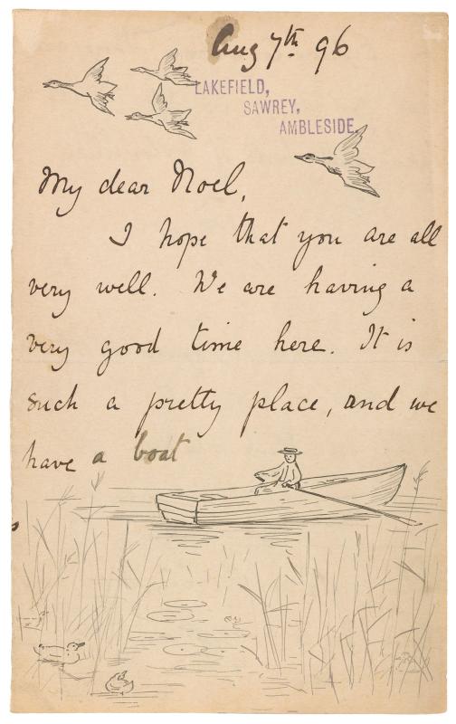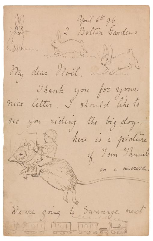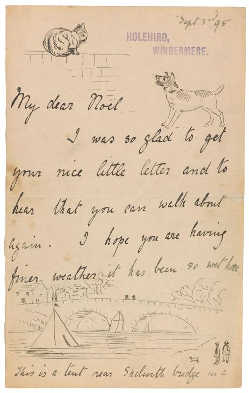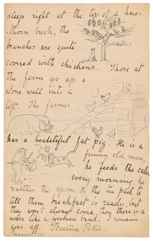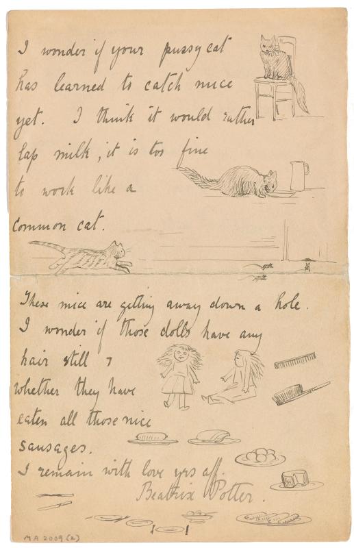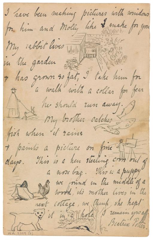 Her books retain the simple joy, subtle wit, and playful immediacy of impromptu private letters written for "real children" on subjects drawn from day-to-day experience with no commercial constraints and no thought of publication. Shown here are the twelve picture letters in the Morgan's collection. Eleven were addressed to Noel Moore, one to his younger sister Marjorie. Here one can see the earliest known picture letter along with later examples containing fanciful illustrations, comical vignettes, and narrative experiments that prefigure Peter Rabbit and other masterpieces of children's literature.