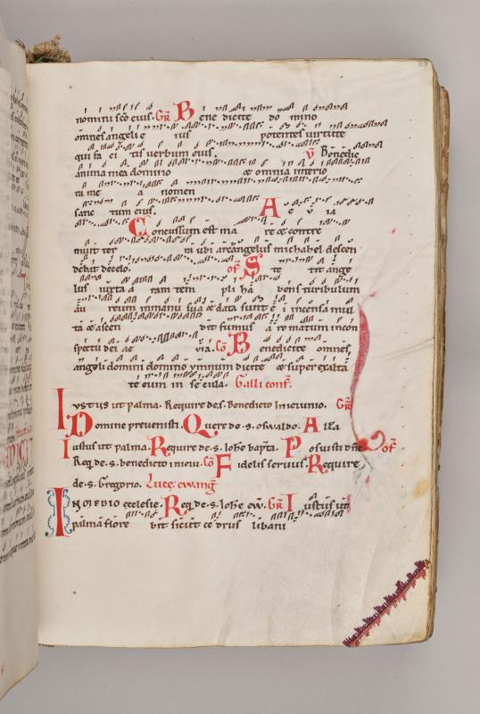 After a burst of activity, the Berthold Master vanished from Weingarten without a trace. Just a few years later, a second professional artist took his place and painted miniatures for an important commission from a high-ranking member of the abbey: this Mass book for the sacristan Henry (Hainricus) to use in a chapel dedicated to the Virgin Mary, which he was responsible for maintaining. Placed unusually at the core of the manuscript just before the Eucharistic prayer, the Coronation of the Virgin, at right, attests to Henry’s devotion to Mary. The surrounding symbols of the four evangelists and four rivers of paradise underscore her central role in the universal Church. The manuscript preserves its original treasure binding, silk curtains, and remarkable thirteen-strand bookmark.