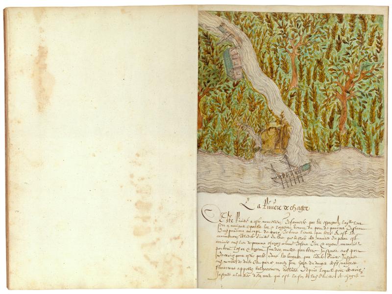 This river has been recently discovered by the Spaniards. It serves their shipping and carries gold and silver from the port of Panama distant by three leagues over land from Cap La Cruz in Panama and is the beginning of said river. When the fleet of ships from Peru arrives in Panama laden with gold and minted silver, they carry the gold and silver on mules over land to the Port of La Cruz in order to ship it in barges on said river to Nombre de Dios, thus avoiding the danger from the runaway negro slaves, commonly called thieves, from the port of La Cruz to the entrance of the sea which is the end of the river,