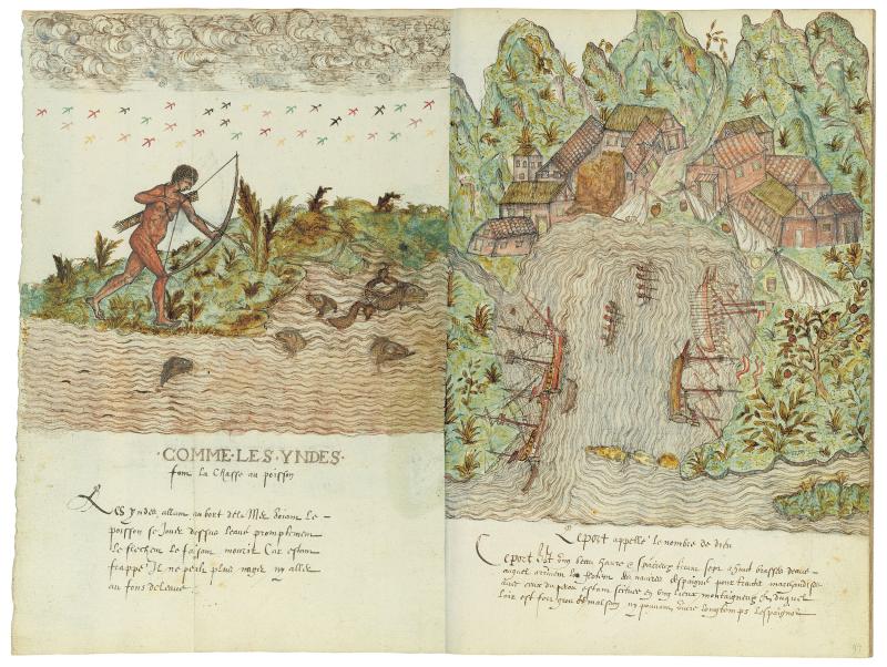 In 1983, The Morgan Library & Museum received, as the bequest of Clara S. Peck, an extraordinary volume whose beautiful paintings and descriptions document the plant, animal, and human life of the Caribbean late in the sixteenth century. Spaniards had already begun to exert influence over the indigenous people of the area when explorers from England and France arrived, among them Sir Francis Drake. The volume, known as the Drake Manuscript and titled Histoire Naturelle des Indes when it was bound in the eighteenth century, gives us a wonderful picture of daily life at the time of Drake's many visits to the region. Although Drake's connection to the manuscript is uncertain, he is mentioned on more than one occasion by the authors. Drake himself is known to have painted, but none of his work survives.