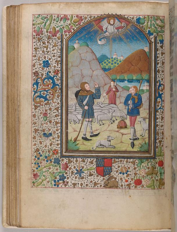Shepherds: Annunciation — Amid sheep, two shepherds, one who is wearing a hood, holding a pedum with his left hand, and raising his right hand, and the other, who is standing next to a hat and playing a bagpipe, look up toward a bust of an angel. The angel is amid rays in an arc of heaven and is holding a scroll inscribed GLORIA IN EXCELSIS DEO ET IN TE[RRA]. . Behind the sheep is a shepherdess holding distaff and spindle. In the background are hills, buildings, and a body of water with a swan in it.