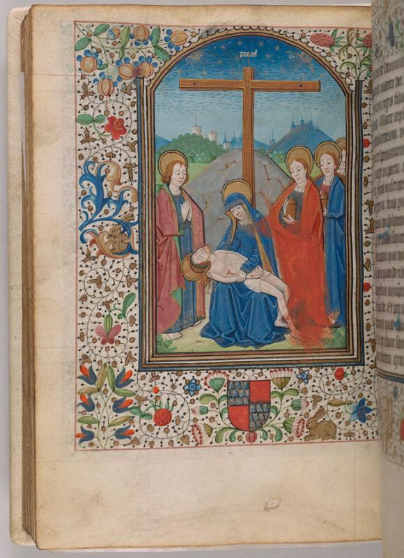 The margins are decorated with floreate ornament, including a strawberry, inhabited by two rabbits. The heraldic shield of Pierre de Bosredont (quarterly, vair and gules) is in the lower margin.