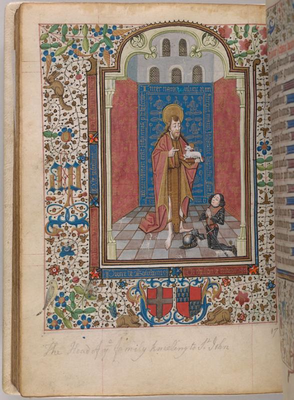 John the Baptist, who has a decorated nimbus, is wearing a garment of animal skin with the head attached. With his right hand, he indicates the Lamb of God, which has a cross-projecting nimbus and is lying on the book held in his left hand. The donor Pierre de Bosredont kneels before him with joined hands. He has a sword at his waist, and a helmet and gauntlet lie on floor beside him. The figures are in a windowed room and are surrounded by three inscribed tapestries: 1) ELIZABETH ... ET MULTUM; 2) INTER NATOS MULIERUM NON SURREXIT MAIOR IOHANNE BAPTISTA FUIT HOMO MISSUS A DEO CUI NOMEN ERAT IOHANNES (from versicle and response of Suffrage based on John 01:06); 3) ZACHARIA ... NATIVITA[...].