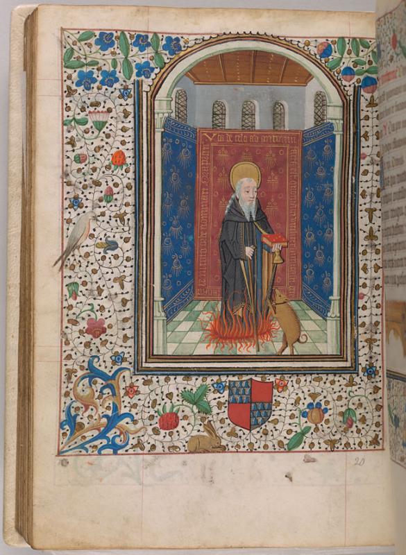A nimbed Anthony Abbot the Great, holding a walking stick in his right hand and a book and bell in his left hand, stands amid flames. A pig stands on its back legs in front of him. The figure is in a windowed room hung with three tapestries. One is inscribed VOS DE CELO AD ANTONIUM FACTA EST QUONIAM VIRILITER DIMICASTI ECCE (HIS) FACIAM TE NI TOTO ORBE NOMINARI ORA PRO NOBIS.