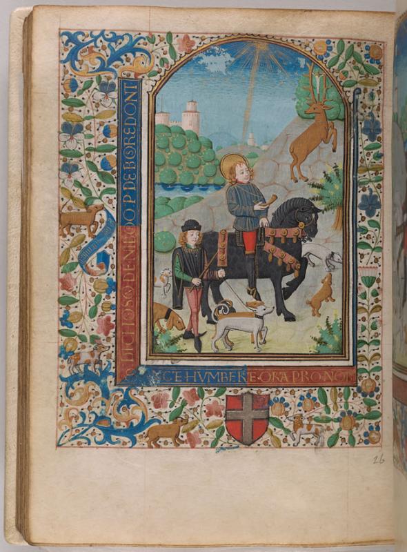 The border is inscribed with the motto of Pierre de Bosredont, DI CHOSSON DE NIBORO, with his name, PIERRE DE BOSREDONT, and an invocation to Hubert of Liáege, SANCTE HUMBERE ORA PRO NOBIS. The margins are decorated with floreate ornament, including a viola, inhabited by four dogs. The heraldic shield of Hospitallers (gules, a cross argent) is in the lower margin.