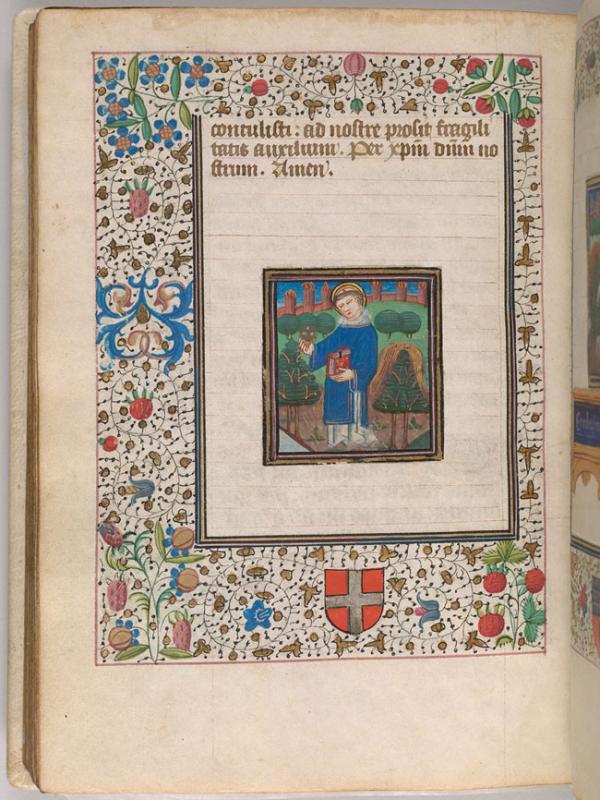 The margins are decorated with floreate ornament. The heraldic shield of Hospitallers (gules, a cross argent) is in the lower margin. Text, Suffrage.