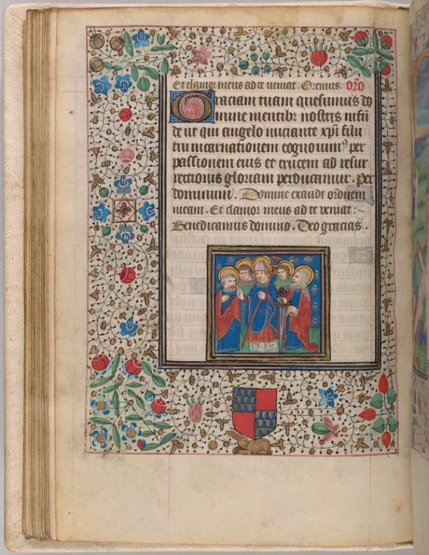 The margins are decorated with foliate and floreate ornament, including a strawberry. In the lower margin is the heraldic shield of Pierre de Bosredont (quarterly, vair and gules) above a rabbit. Text, Mass of the Virgin.