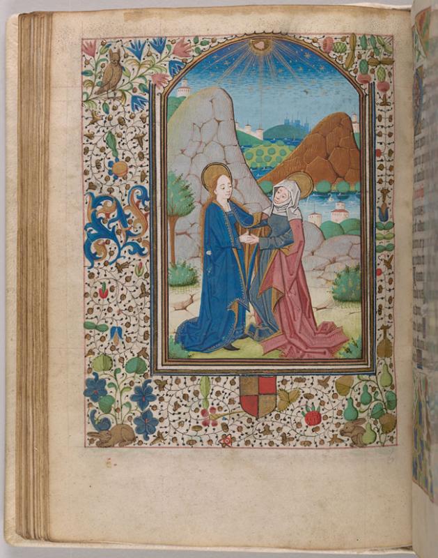 The margins are decorated with floreate ornament inhabited by an owl and two rabbits. In the lower margin is an overpainted, unidentified heraldic shield (quarterly, or and gules).