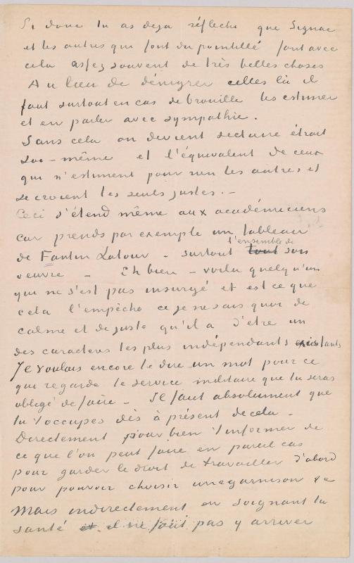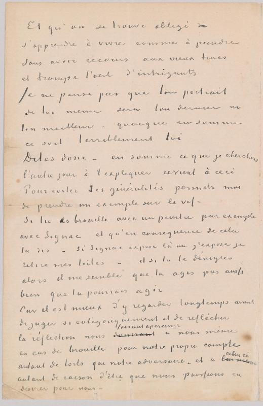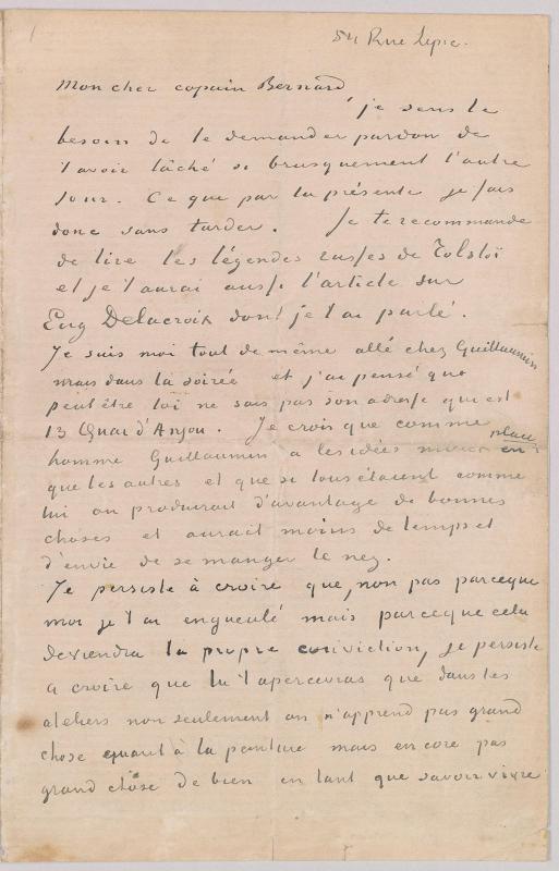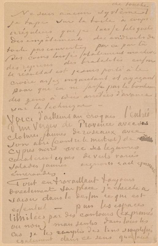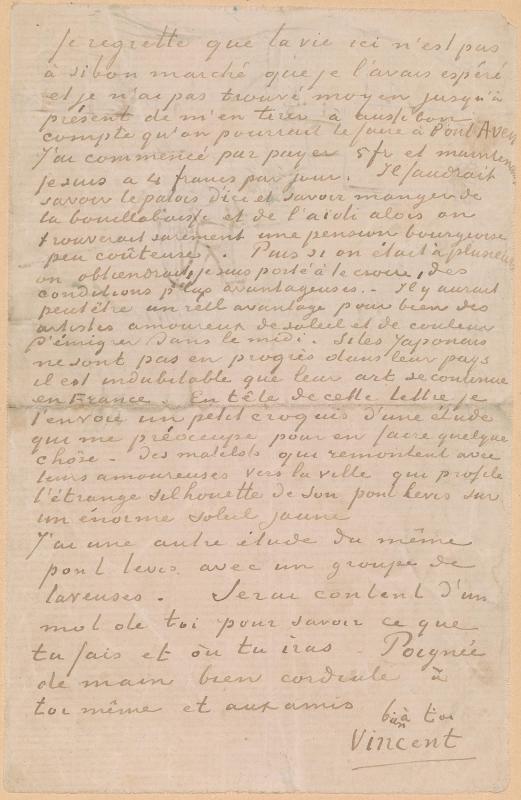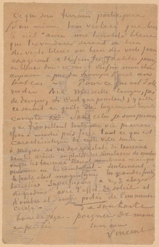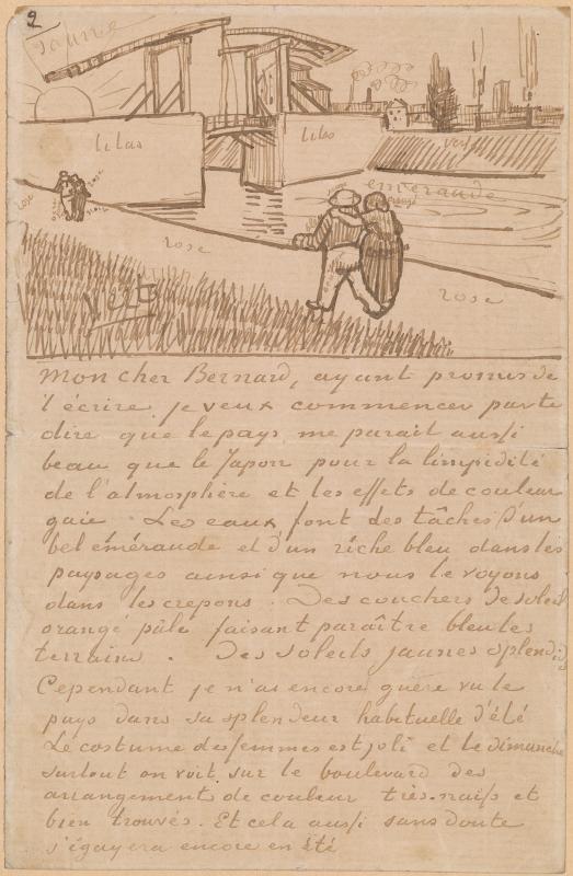 Van Gogh's letters to Bernard reveal the tenor of their relationship. Van Gogh assumed the role of an older, wiser brother, offering praise or criticism of Bernard's paintings, drawings, and poems. At the same time the letters chronicle van Gogh's own struggles, as he reached his artistic maturity in isolation in Arles and St. Rémy. Throughout the letters are no less than twelve sketches by van Gogh meant to provide Bernard with an idea of his work in progress, including studies related to the paintings The Langlois Bridge, Houses at Saintes-Maries-de-la-Mer, Boats on the beach at Saintes-Maries, The Sower, and View of Arles at Sunset.