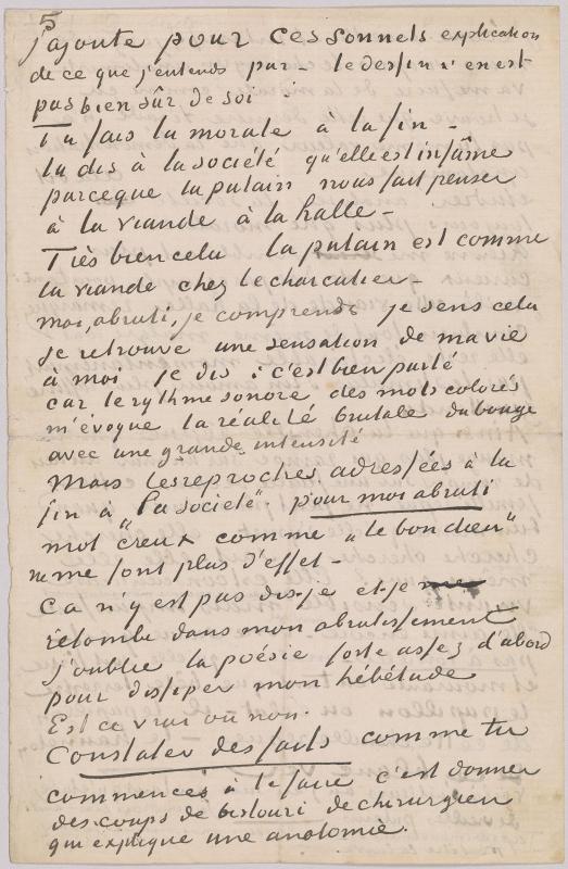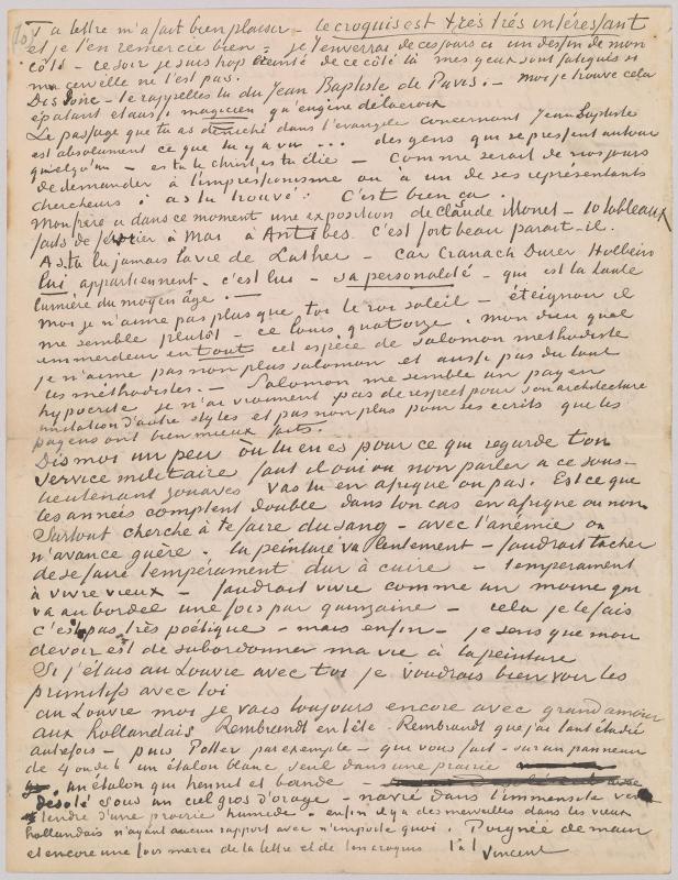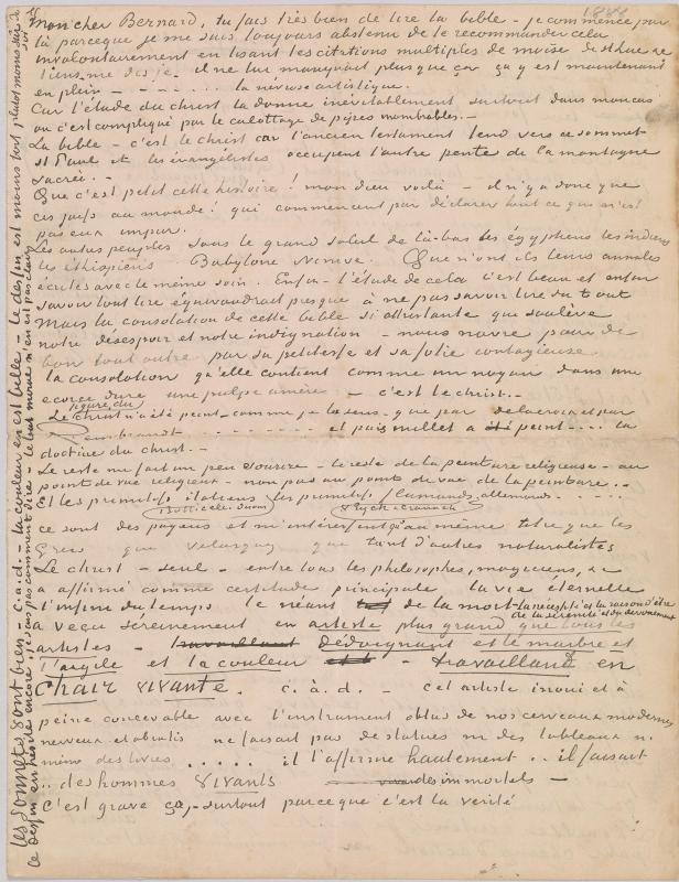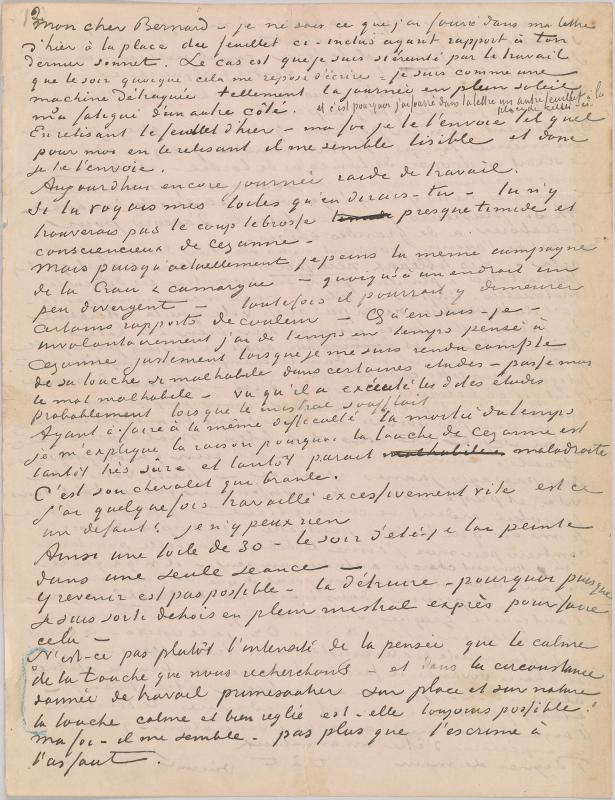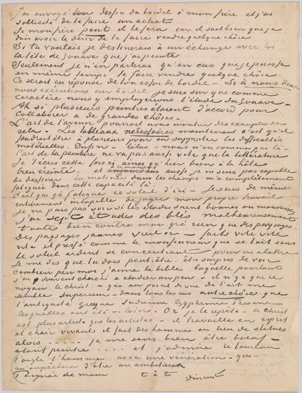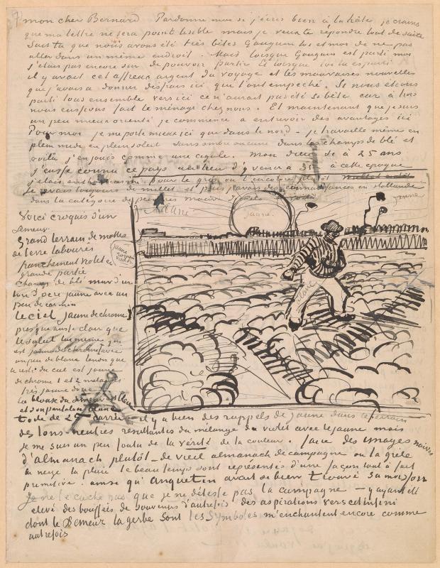 Van Gogh's letters to Bernard reveal the tenor of their relationship. Van Gogh assumed the role of an older, wiser brother, offering praise or criticism of Bernard's paintings, drawings, and poems. At the same time the letters chronicle van Gogh's own struggles, as he reached his artistic maturity in isolation in Arles and St. Rémy. Throughout the letters are no less than twelve sketches by van Gogh meant to provide Bernard with an idea of his work in progress, including studies related to the paintings The Langlois Bridge, Houses at Saintes-Maries-de-la-Mer, Boats on the beach at Saintes-Maries, The Sower, and View of Arles at Sunset.