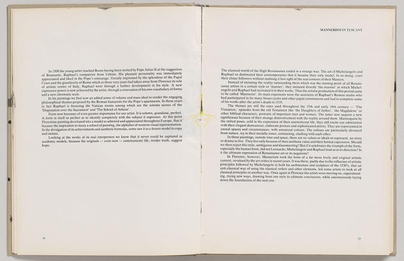 Active in New York in the 1980s and 90s as a sculptor and draftsman, Taylor found inspiration for his lyrical and witty abstract compositions in banal objects and everyday situations. In this unusual object, Taylor drew over text and images in a book on Florentine Renaissance painting. He altered the meaning of the text by blacking out parts of it and offered new interpretations of the paintings through his additions of black ink and white correction fluid. The puddle-like motifs and wordplays relate to the drawings Taylor was making at the same time, such as the 1992 Peabody series, of which the Morgan owns an important example (acc. no. 2011.7).