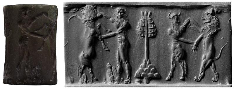 Contest frieze with water buffalo and nude bearded hero; bull-man and lion