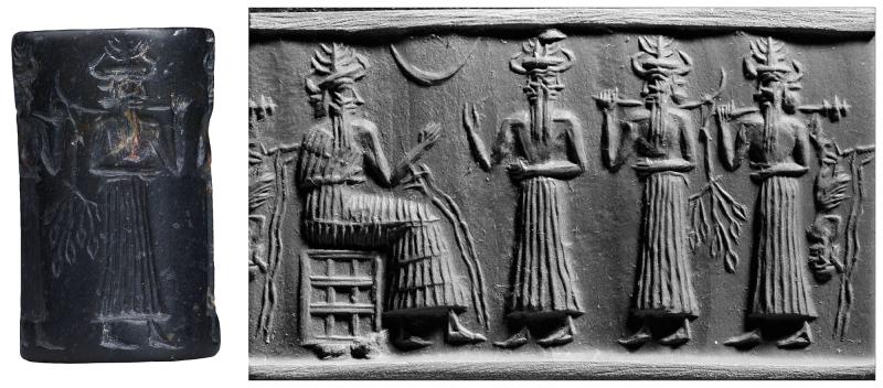 Vegetation god with stalks of grain, god with plow, and god enthroned on heap of grain